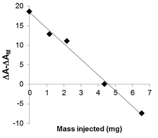 脂質(zhì)體(不同濃度)對(duì)BSP蛋白的作用也如圖5所示。脂質(zhì)體在進(jìn)入亞階段前與精漿接觸。隨著脂質(zhì)體中濃度的增加(曲線M/SP+C1至C4),BSP蛋白吸附引起的表面積增加逐漸延遲并減少。當(dāng)含量達(dá)到4.37 mg(C3)時(shí),界面上仍有少量BSP蛋白摻入,1600 s時(shí)出現(xiàn)肩部。在最高濃度(C4)下,未觀察到BSP蛋白摻入,分子面積的變化甚至比對(duì)照曲線更負(fù),表明膜組分在亞相中輕微溶解。因此,脂質(zhì)體作用于BSP蛋白的方式與LDL相同。最有趣的比例似乎介于C3和C4之間。根據(jù)確定面積變化與脂質(zhì)體注射磷脂質(zhì)量之間相互作用的曲線計(jì)算得出(圖6)。注射26.6 mg BSP的最佳質(zhì)量為4.6 mg,即PC:BSP比為0.16(w/w)。