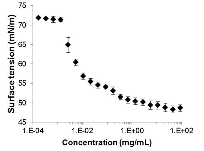 圖2。牛精漿溶液在空氣-水界面處的表面張力(±標(biāo)準(zhǔn)偏差),與提取物中所含蛋白質(zhì)的濃度有關(guān),并以對(duì)數(shù)標(biāo)度表示(T=23.2℃±0.3℃,n=2,每個(gè)樣品重復(fù)4次)。