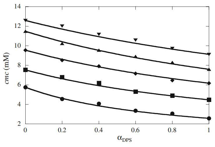 圖8 Mega-10+DPS混合系統(tǒng)的混合臨界膠束濃度(cmc)與αDPS的曲線圖。填充圓、正方形、菱形、三角形和反向三角形分別表示存在0(填充圓)、2(填充正方形)、4(填充菱形)、6(填充三角形)和8(填充反向三角形)mMα-CD時的實驗cmc。實線表示理想的cmc