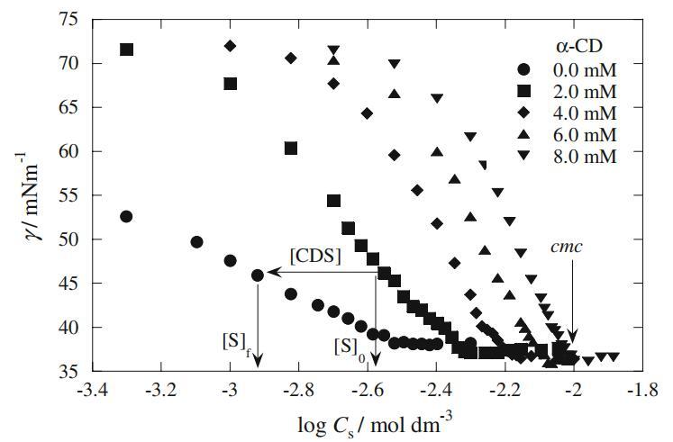 圖1顯示了2 mM Mega-10和DPS溶液的界面張力(γ)隨不同α-CD濃度的變化。兩種表面活性劑溶液的界面張力值均隨α-CD濃度的增加而增加。這種行為表明α-CD與Mega-10和DPS形成包合物,這些包合物沒有任何表面活性。在沒有α-CD的情況下,不同濃度的α-CD的界面張力對應(yīng)于γ值,這證實了CD本身不具有表面活性(數(shù)據(jù)未顯示)。圖2顯示了Mega-10和DPS(αDPS=0.8)混合體系在不同α-CD濃度下的總表面活性劑濃度的γvs.log曲線。每條曲線顯示與cmc對應(yīng)的斷點。在圖2中,由于α-CD中加入了表面活性劑單體,通過降低本體中的游離表面活性劑單體濃度延遲了膠束形成過程,因此每條曲線也移向更高的表面活性劑濃度。此外,cmc以上表面活性劑的γ值與α-CD濃度無關(guān)(圖2)。這表明表面活性劑與α-CD形成的包合物不參與界面吸附。在α-DPS=0.0、0.2、0.4、0.6和1.0時,在不存在和存在2-8mmα-CD濃度的情況下,獲得了類似的曲線圖(數(shù)據(jù)未顯示)。Mega-10和DPS的α-CD濃度依賴性cmc值如圖3所示。圖3清楚地顯示了cmc和α-CD濃度之間的線性關(guān)系。這一行為是表面活性劑和α-CDs之間形成包合物的另一個跡象,導(dǎo)致表觀cmc值增加。純Mega-10(5.75 mM)和DPS(2.57 mM)測定的cmc值與報告的文獻(xiàn)值一致[24–26]。