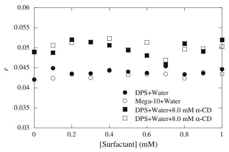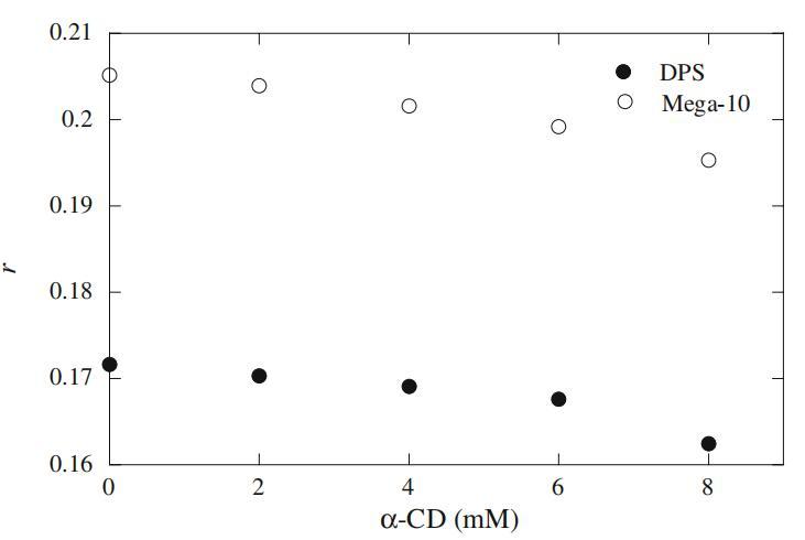 在這項工作中,我們研究了RB與表面活性劑-α-CD-水三元體系的詳細(xì)相互作用,以便系統(tǒng)地研究RB的極化行為。在進(jìn)入膠束介質(zhì)之前,我們排除了RB與水溶液和水溶液α-CD介質(zhì)中前冰層表面活性劑濃度(1 mM)的結(jié)合行為。圖10顯示了在冰層前表面活性劑濃度下,Mega-10和DPS的RB各向異性行為。在水中和存在α-CD(8mm)的情況下,我們未觀察到表面活性劑RB的右旋值有任何顯著變化。從圖10獲得的結(jié)果意味著探針RB不與表面活性劑單體、環(huán)糊精和α-CD表面活性劑包合物結(jié)合。在這些初始測量之后,我們將我們的實驗方法擴(kuò)展到膠束介質(zhì),以觀察RB的各向異性行為。圖11顯示了純表面活性劑以及Mega-10和DPS二元混合物(15mm)的α-CD(2-8mm)依賴性各向異性行為。從圖11可以得出一些有趣的結(jié)論。首先,圖11清楚地表明,在水介質(zhì)中,純Mega-10的膠束比DPS的膠束具有更高的微粘度。這種行為可以用表面活性劑分子在膠束中的堆積排列來解釋,表明Mega-10膠束中的堆積比DPS膠束中的更緊密。對于二元混合物,r值隨著DPS(αDPS)摩爾分?jǐn)?shù)的增加而減小,這表明DPS被誘導(dǎo)到混合膠束中產(chǎn)生的剛性結(jié)構(gòu)較低(參見圖11中最左邊的圖例)。其次,在DPS的每摩爾分?jǐn)?shù)下,r值隨α-CD濃度的增加而線性減小。盡管隨著α-CD濃度的增加,在αDPS=0.0時,r值的下降更為瞬時。我們注意到,r值的瞬時降低是由于膠束濃度的降低。為了證實這一結(jié)果,我們在20 mM濃度下對αDPS=0.0(即Mega-10)進(jìn)行了各向異性測量,圖12中繪制了Mega-10的觀測r值,并與15 mM濃度下的αDPS=1.0(即DPS)進(jìn)行了比較。正如我們所見,隨著α-CD濃度的增加,Mega-10(20 mM)的r值沒有瞬時下降,這表明圖11中r值的急劇下降是由于膠束濃度的降低。DelaCruz等人研究了RB衍生物與陰離子、陽離子和非離子表面活性劑的相互作用,并得出結(jié)論,RB衍生物的酯鏈的電荷和長度控制著與不同膠束系統(tǒng)的相互作用[35]。