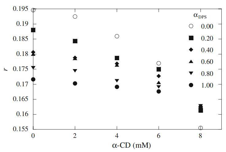 根據(jù)方程式15,我們計算了在不存在和存在α-CD的情況下當(dāng)前二元混合物的膠束組成(X1)。圖9顯示了混合膠束(X1)和體積摩爾分?jǐn)?shù)(α1)中表面活性劑的組成。從圖9可以得出結(jié)論,在αDPS=0.2時,混合膠束中DPS的組成接近40%。存在α-CD時的X1值始終低于水的X1值。這種行為可能反映出α-CD通過降低其結(jié)合最強的表面活性劑的量來改變成分(見Ka值)。一般來說,CDs不與膠束相互作用,但CDs可能通過與溶液中的表面活性劑相互作用影響膠束的組成,從而改變膠束的平衡和組成。熒光各向異性為了研究混合膠束中兩種不同組分的行為,我們還使用RB作為熒光探針進(jìn)行了偏振熒光測量。這種探針在膠束介質(zhì)中已經(jīng)得到了很好的表征[33]。探針熒光發(fā)射的去極化程度是其激發(fā)態(tài)壽命期間旋轉(zhuǎn)擴(kuò)散的度量。熒光各向異性(r)通過Perrin方程與探針周圍的粘度相關(guān),如下[34]: