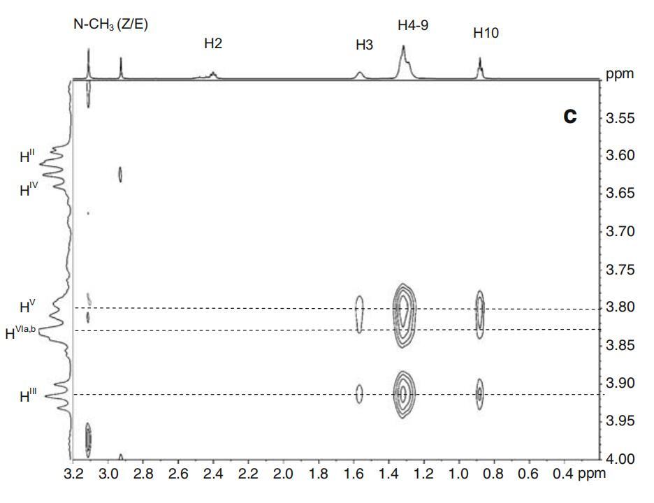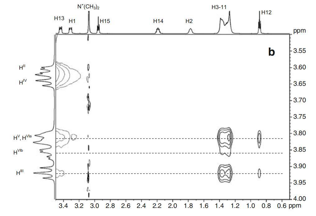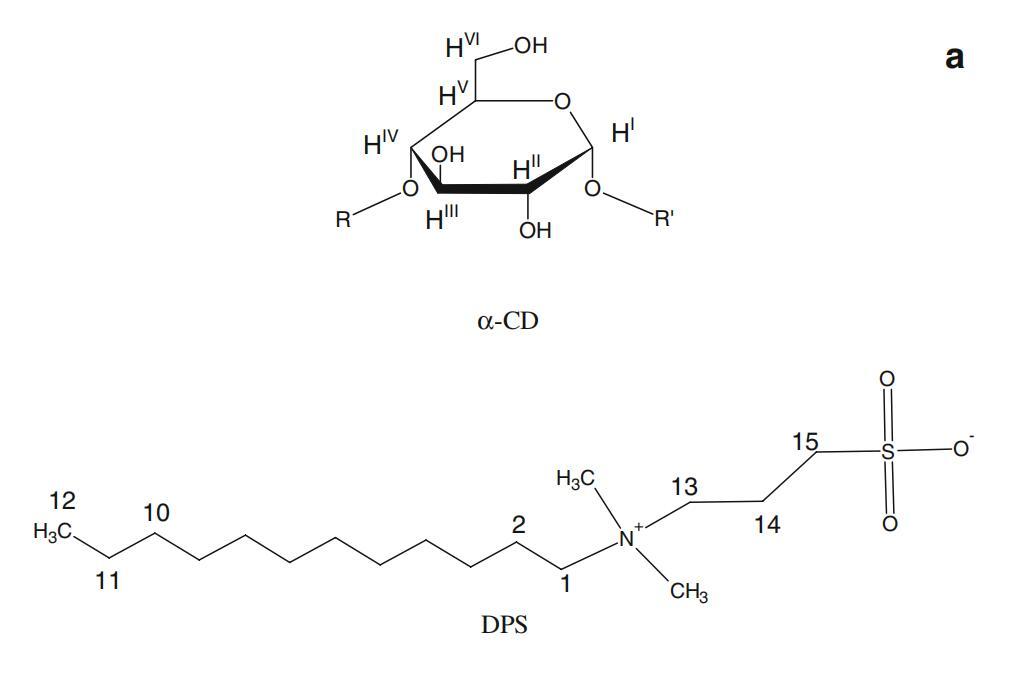 圖7a顯示了α-CD、DPS和Mega-10的示意圖,以簡化表面活性劑原子與CD原子的相互作用。2DROESY數(shù)據(jù)證明表面活性劑的烷基鏈包含在α-環(huán)糊精的疏水腔中。光譜如圖7b和c所示??梢钥吹奖砻婊钚詣┕舱衽c位于環(huán)糊精空腔內(nèi)的HIII、HV和HVI共振的交叉峰。未觀察到分子(HI、HII和HIV)外部與環(huán)糊精原子的相互作用。對于這兩種表面活性劑,與HIII和HV的相互作用似乎覆蓋了從末端甲基到H3的整個烷基鏈。這意味著幾個不同的復(fù)雜幾何形狀和穿透深度之間的快速交換。在鎘原子和親水性頭基之間沒有觀察到相互作用。
