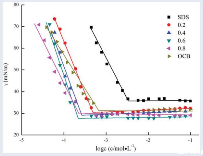 用表面張力法研究了橄欖油兩性表面活性劑(羧基甜菜堿OCB和磺基甜菜堿OSB)與陰離子表面活性劑十二烷基苯磺酸鈉(SDBS)在不同摩爾分數(shù)下的表面性質。研究了無機鹽(NaCl、MgCl2)的加入對OCB/SDBS和OSB/SDBS體系表面活性的影響。結果表明,這兩種混合體系在所研究的所有摩爾分數(shù)上都比它們各自的組分具有更低的CMC值和更高的表面活性。同時,根據正規(guī)溶液理論,通過膠束相互作用參數(shù)(βm)確定了OCB/SDBS和OSB/SDBS之間明顯的協(xié)同作用。觀察到,αOCB=0.6時的OCB/SDBS混合體系和αOSB=0.6時的OSB/SDBS混合體系表現(xiàn)出最強的協(xié)同作用。此外,添加無機鹽后,二元表面活性劑混合物表現(xiàn)出更好的表面活性,并且無機鹽金屬離子的不同價態(tài)對混合體系的表面能力影響不同:Mg2+>Na+。
