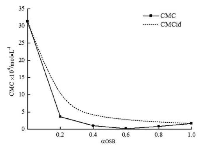圖8。研究了實(shí)驗(yàn)CMC、理想CMC與OSB摩爾分?jǐn)?shù)的關(guān)系。