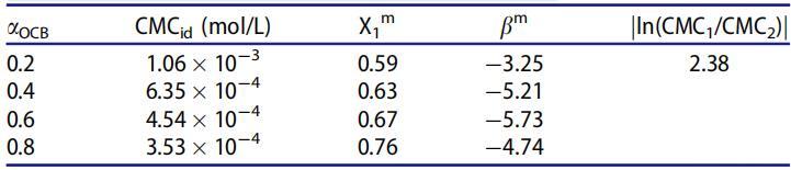 理想CMC值如表3所示,并與圖6中的實(shí)驗(yàn)CMC值一起繪制為OCB摩爾分?jǐn)?shù)的函數(shù)。CMC與CMCid的偏差可以預(yù)測(cè)混合膠束的非理想性。結(jié)果表明,對(duì)于所研究的系統(tǒng),實(shí)驗(yàn)CMC值低于CMCid。由于結(jié)構(gòu)的不同,這種偏差與二元體系的非理想混合行為一致,CMC的值低于相應(yīng)的CMCid值可歸因于不同表面活性劑之間的吸引作用導(dǎo)致的混合膠束形成。