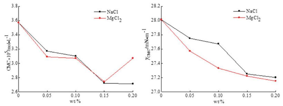 圖9。無(wú)機(jī)鹽(NaCl和MgCl2)對(duì)OCB/SDS體系中表面活性的影響。