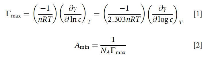 根據(jù)吉布斯吸附等溫線方程(方程1和2)[23]的近似形式計(jì)算最大表面過(guò)剩(Cmax)和最小表面積(Amin):