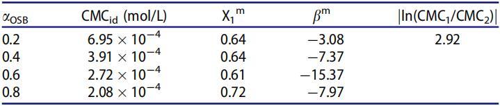 表5。25℃水溶液中不同摩爾分?jǐn)?shù)(αOSB)OSB/SDS體系的非理想性及相互作用參數(shù)。