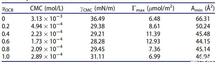 表2。OCB/SDS體系在25℃水溶液中不同摩爾分?jǐn)?shù)(αOCB)的表面性質(zhì)。