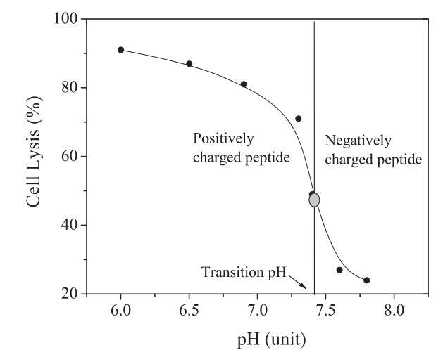 如前所述(6),在負(fù)載鈣黃綠素的大單膜囊泡(LUV)上測試肽的裂解活性。通過將激發(fā)和發(fā)射波長分別設(shè)置為485和530 nm,使用熒光微孔板讀取器監(jiān)測肽誘導(dǎo)的鈣黃綠素泄漏(通過熒光強(qiáng)度的增加反映)。從LUV釋放的鈣黃綠素表示為F/F0,其中F0和F分別表示在不存在和存在肽的情況下負(fù)載鈣黃綠素的LUV的熒光強(qiáng)度。已經(jīng)證明,pH敏感裂解肽的活性變化通常發(fā)生在狹窄的pH范圍內(nèi),即所謂的肽轉(zhuǎn)變pH值,即當(dāng)肽的凈電荷為零(6)時(shí)的pH值,如圖1所示。使用納米試劑(6)測定肽的過渡pH值。簡單地說,用不同pH值(pH=5.0–9.0)的PBS稀釋來自儲(chǔ)備溶液(水中5mM)的肽。對(duì)新制備的肽溶液(40 lM)進(jìn)行短暫(60秒)的超聲處理。使用zeta納米分析儀在超聲處理后立即測量肽溶液的zeta電位。