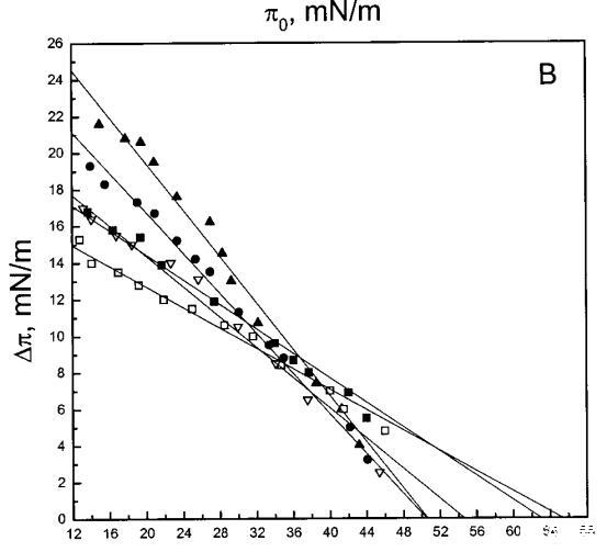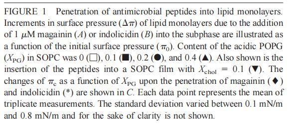 通過測量表面壓力的增量,觀察到抗菌肽在不同初始表面壓力(π0)下嵌入到空氣/水界面上的脂質(zhì)單層中(?π)將肽添加到亞相后(Brockman,1999;Verger和Pattus,1976)。Magainin 2在π0>12 mN/m時(shí)容易插入SOPC單層(圖1A),而在π0以上≈35 mN/m時(shí),其在膜中的滲透被消除,因此該值表示該肽與SOPC膜相互作用的臨界包裝壓力πc。根據(jù)其凈正電荷4(Matsuzaki,1998),當(dāng)膜中酸性磷脂POPG的含量增加時(shí),magainin 2向脂質(zhì)單層的滲透逐漸增強(qiáng)(圖1 A)。因此,消除magainin 2插入單層的πc值增加至~39(XPG=0.1)、43(XPG=0.2)和46 mN/m(XPG=0.4)(圖1c)。相反,在SOPC膜中加入膽固醇(Xchol=0.1)對magainin 2的滲透沒有顯著影響(圖1A)。