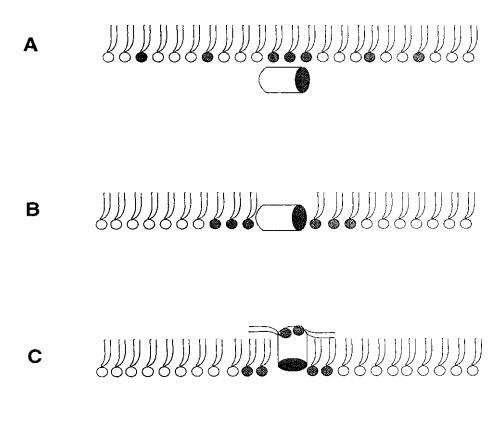 對于測試的所有單層組成,吲哚青霉素的πc值超過了馬蓋寧2的測量值(圖1 c),表明該肽在?;溨g有效插入和插層。吲哚西丁在~38 mN/m的交叉點(diǎn)值得關(guān)注。在后一個(gè)表面壓力之下,表面壓力的增量??在PG存在的情況下,吲哚西丁引起的反應(yīng)增強(qiáng),而在較高的初始脂質(zhì)堆積密度下觀察到相反的反應(yīng)。有趣的是,不管脂質(zhì)成分(即PG的存在)如何,交叉點(diǎn)幾乎保持不變,因此表明它可以完全由表面壓力決定,而不管靜電相互作用如何。一種可能的機(jī)制是,在π0>38 mN/m時(shí),吲哚西丁以壓力依賴的方式改變其在單層中的取向,可能是從其長軸相對于層平面的平行到垂直取向(圖9,B和C),從而減少面積/肽并減少?π.此外,一些靜電結(jié)合吲哚肽的PG分子也可能與單層中的磷脂方向不同。換句話說,吲哚西丁與其相關(guān)的PG將形成一種超分子復(fù)合物,其取向?qū)⑷Q于壓力。這在圖9中示意性地示出。重要的是,所提出的肽連接磷脂的重新定向?qū)⑴c最近提出的模型兼容,在該模型中,穿過雙層的孔表面的一部分將由脂質(zhì)頭基構(gòu)成(Ludtke et al.,1996)。