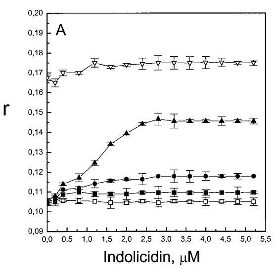 與magainin 2類似,吲哚青霉素與陰離子和兩性離子囊泡的膜結(jié)合非常不同(圖1b、4和5),與先前的平衡透析研究一致(Ladokhin et al.,1997)。雖然芘熒光的猝滅顯示吲哚肽被分配到SOPC雙層中,但對膜酰基鏈順序幾乎沒有影響(圖5)。相反,吲哚西啶與陰離子膜的相互作用導(dǎo)致脂酰鏈順序增加,明顯表現(xiàn)為DPH熒光各向異性增加,并對XPG呈S形依賴(圖5)。與magainin 2相反,吲哚西丁導(dǎo)致芘單體和準(zhǔn)分子發(fā)射強(qiáng)度顯著平行降低,與脂質(zhì)成分無關(guān),Ie/Im變化較?。▓D4)。相應(yīng)地,吲哚西丁誘導(dǎo)酸性PG富集到微區(qū)。有趣的是,在吲哚西丁/脂質(zhì)摩爾比為1:20以下,芘Im的減少順序?yàn)閄PG=0.40.20.10(圖4a),而在吲哚西丁/脂質(zhì)摩爾比為1:10時(shí),Im的減少對XPG的依賴性相反。這種變化的可能機(jī)制如下。在低肽/脂摩爾比時(shí),吲哚西丁似乎被調(diào)節(jié)到雙層界面(Ladokhin等人,1997),芘標(biāo)記鏈的鏈反轉(zhuǎn)(Holopainen等人,1999)使該部分更接近雙層表面,從而允許其與吲哚西丁的基本殘基接觸。后者通過π-陽離子相互作用導(dǎo)致芘部分的碰撞猝滅。然而,隨著XPG的增加,我們可以預(yù)期PG頭基與吲哚西丁的堿性殘基發(fā)生靜電結(jié)合,從而阻止芘與吲哚西丁的陽離子殘基之間的直接接觸。隨著肽濃度的增加,吲哚肽的膜結(jié)合以協(xié)同方式增強(qiáng),猝滅效率的逆轉(zhuǎn)可能涉及雙分子層中脂肽復(fù)合物的聚集。因此,在酸性含磷脂的膜中,吲哚對芘的猝滅作用較小。當(dāng)吲哚肽的濃度增加到肽/脂比1:10以上時(shí),肽將以高度協(xié)同的方式并入膜的?;渽^(qū)域(Ha等人,2000)(圖9 E),而在中性膜中,肽位于界面(圖9 D)。插入吲哚西丁的量取決于雙層中的XPG,導(dǎo)致吲哚西丁的Trp殘基的猝滅占主導(dǎo)地位,與XPG=0.4時(shí)Im的顯著減少一致(圖4a)。