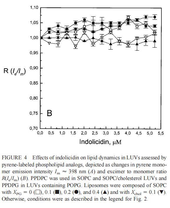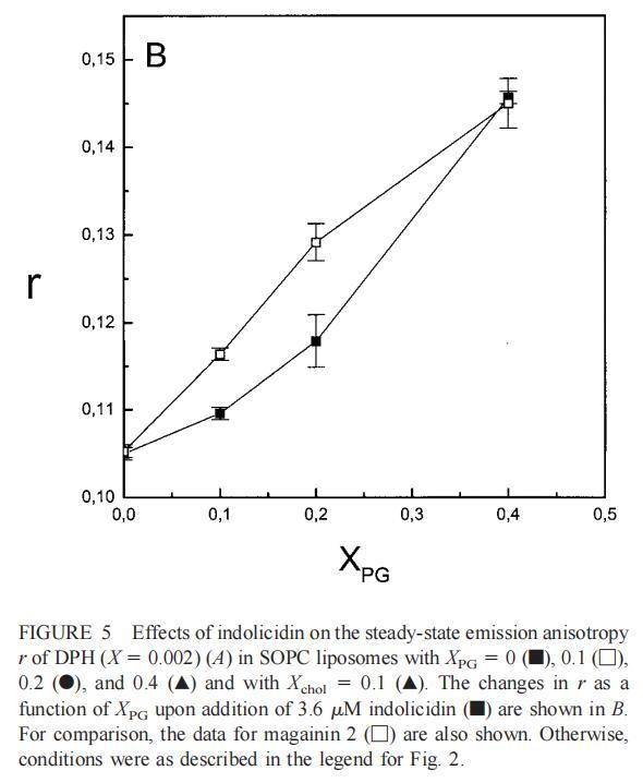雖然熒光光譜顯示,馬蓋寧2和吲哚西啶對脂質(zhì)動(dòng)力學(xué)的影響存在明顯差異,但也存在一些明顯的相似之處。因此,DPH各向異性r的增加表明,在存在酸性磷脂的情況下,這兩種肽都會(huì)導(dǎo)致?;滍樞虻脑黾?,這種影響的程度隨著XPG的增加而增加(圖3b和5b)。同樣,在膽固醇存在的情況下,兩種肽對芘熒光的有效猝滅也很明顯(圖2a和4a)。這可能與膽固醇的OH基團(tuán)和馬蓋寧的E19殘基之間的相互作用有關(guān)(Tytler等人,1995年),該肽在膜中具有跨膜取向。當(dāng)Xchol=0.1時(shí),r值的增加是由于吲哚西丁所致,而馬加寧則無影響。這表明,在膽固醇存在的情況下,吲哚肽可能采用跨雙層取向,其長軸垂直于雙層平面。