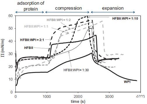 值得注意的是,對于純HFBII,П–A等溫線在連續(xù)的壓縮膨脹循環(huán)中不會發(fā)生變化,這再次表明HFBII不可撤銷地附著在界面上,幾乎沒有任何構(gòu)象變化。對于純WPI和1:1混合物,П–A等溫線略微向較小區(qū)域移動,這表明由于WPI分子的構(gòu)象變化、多層形成或如前所述,由于WPI的解吸,表面重排的可能性較小。
