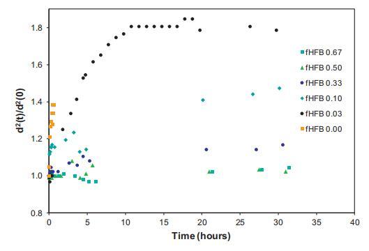 氣泡尺寸隨時間的相對增加如圖9所示,表示為d2(t)/d2(0)。考慮到環(huán)境充氣樣品的泡沫穩(wěn)定性,對于純HFBII系統(tǒng),在本實驗期間未發(fā)現(xiàn)平均氣泡尺寸的顯著變化,表明幾乎不可能發(fā)生任何歧化。在純WPI的情況下,可以發(fā)現(xiàn)氣泡尺寸急劇增加,表明對歧化的穩(wěn)定性較差。在混合情況下,隨著fHFBII的增加,我們可以看到氣泡尺寸穩(wěn)定性增加的趨勢。我們可以粗略地說,當fHFBII<0.2時,氣泡大小的初始演化在很大程度上取決于WPI。然而,當fHFBII>0.2時,HFBII的存在控制泡沫穩(wěn)定性。這與在朗繆爾槽中觀察到的初始氣泡大小和吸附層的趨勢非常一致。
