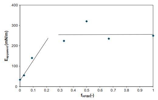 為了便于比較,從圖1的數(shù)據(jù)中,使用表面壓力第一次上升的斜率(由第一次壓縮產(chǎn)生)和公式E=(?2)提取了表觀膨脹模量(E)??1)/ln(A1/A2)。曲線的斜率總是在表面壓力在15到25 mN/m之間波動的表面積范圍內(nèi)確定的。圖2顯示了表觀模量作為混合比的函數(shù),表示為HFBII分數(shù)fHFBII=cHFBII/(cHFBII+cWPI)。