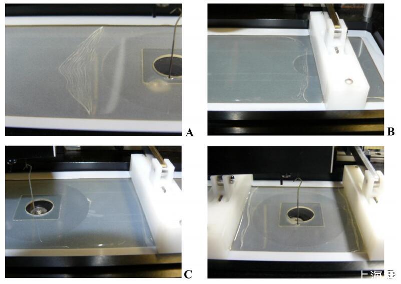圖5。在液體中不同疏水組分的朗繆爾槽上,HFBII/WPI混合溶液的吸附層照片:a:fHFBII=1,B:fHFBII=0.67,C:fHFBII=0.5,D:fHFBII=0.33。