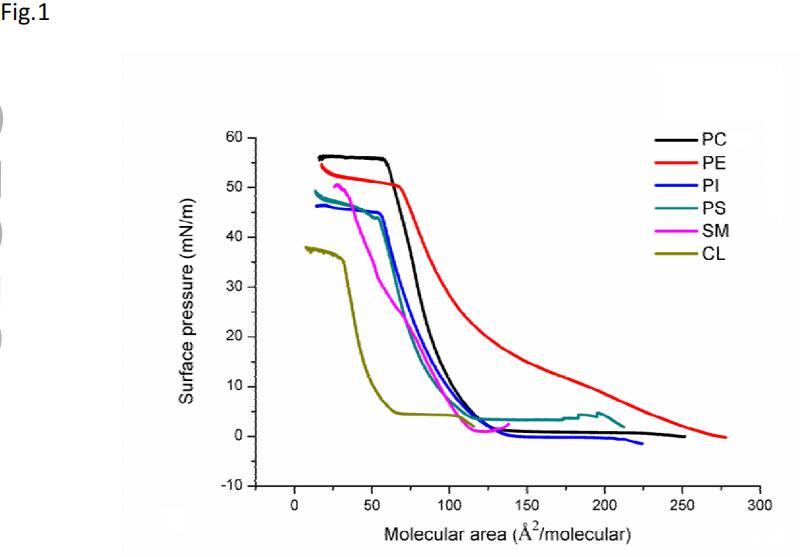 圖1顯示了空氣-水界面上不同磷脂單層的π-A曲線形狀。這里測試的所有磷脂的π-A曲線的形狀都是在所有顯示的表面壓力下單一液體膨脹(LE)和液體冷凝(LC)狀態(tài)的特征。在壓縮時(shí),單層經(jīng)歷了一個轉(zhuǎn)變,這被視為從LE(低于10 mN/m)到LC狀態(tài)的轉(zhuǎn)變。在高分子區(qū)域,由于分子堆積的增加,表面壓力升高,但不改變單層膜的彈性。最后,單分子膜達(dá)到了一種更為濃縮的狀態(tài),但在π-a等溫線的形狀中沒有明顯的崩塌點(diǎn)。對于這里測試的磷脂,它們都可以形成穩(wěn)定的膜,并表現(xiàn)出良好的壓縮性能,DOPC的表面壓力甚至達(dá)到57 mN/m。