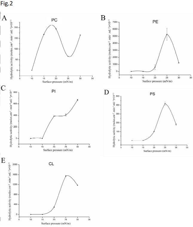 圖2示出了使用各種磷脂作為水解底物獲得的詳細(xì)活性-表面壓力曲線。可以看出,酶的水解活性高度依賴于表面壓力。然而,每種底物的活性曲線不同。發(fā)現(xiàn)基板PE、PS和CL的鐘形曲線具有特征性的最佳表面壓力值(圖2B、D、E)。在低于15 mN/m的表面壓力下,未檢測到基本酶活性。水解活性隨表面壓力的增加而增加。在25 mN/m的表面壓力下,觀察到PE、PS和CL的最大活性。然而,當(dāng)表面壓力高于25 mN/m時(shí),所有這些磷脂的水解活性降低。與所有測試的底物相比,在25 mN/m的表面壓力下,PE的水解率最高,水解活性達(dá)到5272.31×10-11摩爾。cm-2。最小-1。mL-1。對于PI,在15 mN/m以下也沒有觀察到水解速率,但是,沒有觀察到鐘形曲線,并且隨著表面壓力從15 mN/m增加到30 mN/m,活性增強(qiáng)(圖2C)。對于PC,從10 mN/m到25 mN/m觀察到鐘形曲線,但在30 mN/m的表面壓力下,活性進(jìn)一步增加。隨著表面壓力從25 mN/m增加到30 mN/m,表面輪廓上的單層構(gòu)象可能發(fā)生了變化,導(dǎo)致活性增加。在本實(shí)驗(yàn)中,在測試的表面壓力范圍內(nèi),SM沒有活性。從π-A曲線可以看出,在25 mN/m的表面壓力下測試的所有磷脂都處于液態(tài)冷凝狀態(tài),沒有達(dá)到各自的坍塌壓力。在這種情況下,超卵磷脂酶對不同單分子磷脂膜的偏好順序?yàn)镻E>CL>PS>PI>PC。在這些條件下,SM沒有活性。Lecitase Ultra選擇性的詳細(xì)機(jī)制仍需闡明。