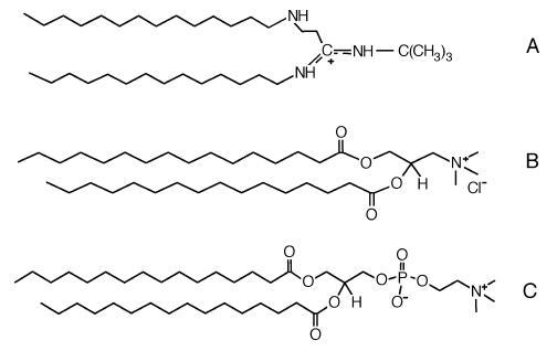 圖1.(A)雙14酰胺的分子結(jié)構;(B)DPTAP;和(C)DPPC。