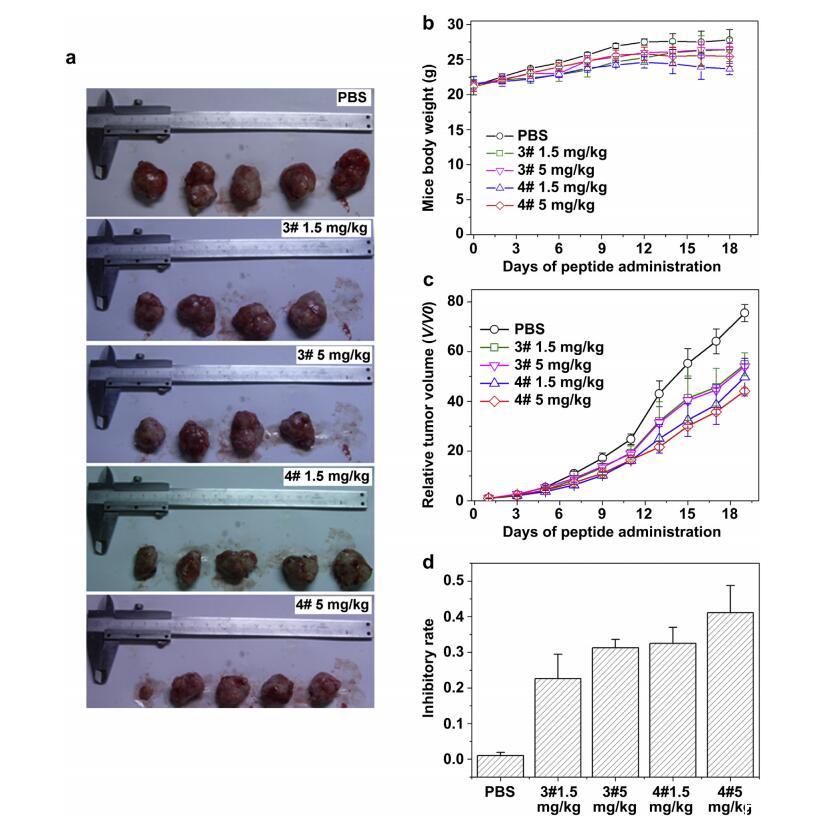 將人宮頸癌HeLa細(xì)胞接種于裸鼠皮下。腫瘤植入5天后,分別以1.5 mg/kg和5 mg/kg的劑量腹腔注射肽G(IIKK)3INH2和G(IIKK)4I-NH2。在給藥期間,未觀察到任何毒性跡象,如體重減輕和外觀不良(圖6b),盡管G(IIKK)4I-NH2顯示出更高的體外溶血性。與PBS中的陰性對(duì)照相比,這兩種肽對(duì)腫瘤生長(zhǎng)表現(xiàn)出明顯的抑制作用,其中G(IIKK)4I-NH2表現(xiàn)出比G(IIKK)3I-NH2更好的療效(圖6c),這與它們的體外抗腫瘤趨勢(shì)一致。18天后,解剖腫瘤并稱重(圖6a和d)。在1.5 mg/kg和5 mg/kg劑量下,G(IIKK)3I-NH2治療組的腫瘤生長(zhǎng)抑制率分別為0.23和0.31。G(IIKK)4I-NH2能產(chǎn)生更有效的抑制作用,在1.5 mg/kg和5 mg/kg劑量下,抑制率分別為0.32和0.41。這些數(shù)據(jù)表明,在小鼠異種移植模型中,螺旋肽可以有效地抑制腫瘤生長(zhǎng),而腫瘤細(xì)胞不能被完全清除。許多抗腫瘤藥物的不完全抑制作用已被廣泛觀察到,這可歸因于多種機(jī)制,例如藥物從腫瘤部位相對(duì)較快地清除,以及它們難以通過(guò)壞死區(qū)域擴(kuò)散[42],但目前這組肽背后的確切原因有待進(jìn)一步的機(jī)理研究。