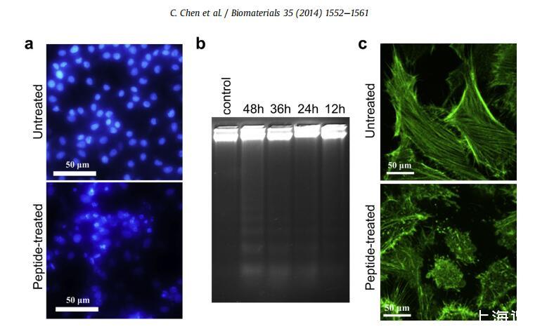 圖4。細(xì)胞凋亡的生化和形態(tài)學(xué)特征。(a)HeLa細(xì)胞與10 mM G(IIKK)3I-NH2孵育24小時(shí)前后的DAPI核染色。(b)HeLa細(xì)胞與10 mM G(IIKK)3I-NH2孵育后提取的基因組DNA的凝膠電泳分析。(c)在與10 mM G(IIKK)3I-NH2孵育24小時(shí)之前和之后,用FITC phalloidin對(duì)HeLa細(xì)胞進(jìn)行F-肌動(dòng)蛋白染色。