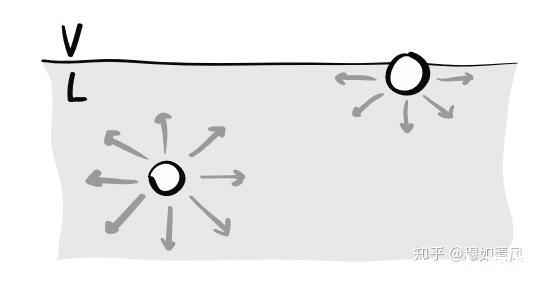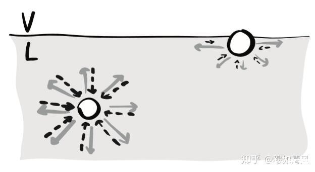 即,對于體相中的分子,其所受斥力在各方向均等大反向;而對于位于表面的分子,粒子之間的排斥力從(氣相中的)忽略不計(jì),在經(jīng)過幾個(gè)分子層后,迅速增加到體相的強(qiáng)度。在這一增加過程中,由于排斥力的各向同性本質(zhì),其在任一位置的強(qiáng)度在各個(gè)方向是一樣的。