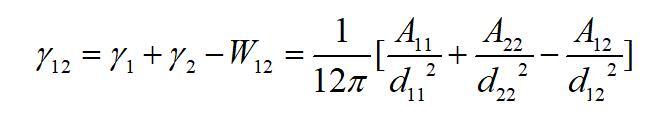 為物質(zhì)1的Hamaker常數(shù)。該作用勢能就相當(dāng)于本體的內(nèi)聚功。從表面自由能的定義不難看出,當(dāng)將本體沿本體內(nèi)的一個界面分開時,單位面積需要克服內(nèi)聚力所做的功就等于這個作用勢能。由于分開后形成兩個新表面,因此每個表面上的勢能等于該勢能的一半。因此物體的表面自由能(表面張力)也等于該作用勢能的一半,即