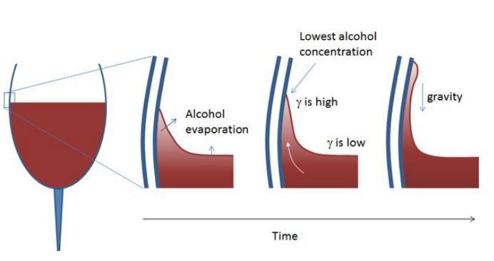 水由于強(qiáng)有力的氫鍵的存在,使得其表面張力極強(qiáng)。正是由于表面張力的存在,因此葡萄酒和杯壁交界處有一個(gè)薄薄的彎月面,它的存在加上表面乙醇的蒸發(fā),使得此處水的占比較大,因此具有較大的表面張力。而酒內(nèi)部的乙醇濃度較高,表面張力較小,因此與彎月面處形成了一個(gè)表面張力梯度,從而內(nèi)部的酒逐漸向彎月面移動,彎月面處的酒逐漸變多,逐步形成一個(gè)個(gè)小酒滴。但當(dāng)酒滴大到一定程度時(shí),由于重力作用,它便會滴下來,這就是“酒淚”現(xiàn)象了。