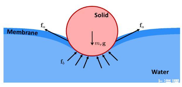 其中是流體表面的面積,稱為表面張力系數(shù)。當(dāng)流體與固體發(fā)生作用時(shí),流體表面的分子同時(shí)會(huì)受到固體分子的作用,從而將表面張力作用在固體上。固體根據(jù)表面特性不同可以分為親水和疏水兩類,疏水材質(zhì)在水面上會(huì)受到向上的表面張力作用,對(duì)于一些細(xì)小的結(jié)構(gòu)來說這個(gè)力要比浮力更為明顯。比如說水黽是一種可以生活在水面上的昆蟲,它的腳非常細(xì)長,并且有很多絨毛來保持疏水特性,因而水黽可以依靠表面張力維持自身的重量,并通過腳來劃動(dòng)水面來向前運(yùn)動(dòng)甚至跳起。