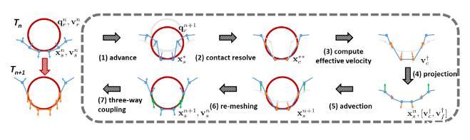 我們的耦合系統(tǒng)分為三個(gè)部分:流體,表面層,固體。流體部分我們采用傳統(tǒng)的歐拉網(wǎng)格的模擬方法,在交錯(cuò)網(wǎng)格(Staggered Grid)上用算符分離的方法求解離散不可壓的Navier Stokes方程。固體部分采用傳統(tǒng)的拉格朗日方法求解牛頓方程。我們的主要貢獻(xiàn)在于在流體與固體之間插入了一層有質(zhì)量、有厚度的流體表面層,這個(gè)表面層直接對(duì)應(yīng)我們上面介紹的流體表面分子稀疏的部分。因?yàn)檫@個(gè)表面層非常薄,我們可以使用帶虛擬厚度的單層三角網(wǎng)格來表示,然后在這個(gè)表面層上施加表面張力勢能。為了將這三個(gè)部分耦合起來,我們在表面層和背景網(wǎng)格、固體和背景網(wǎng)格之間定義了速度的插值矩陣,同時(shí)將流體的壓強(qiáng)作用在表面層和固體上,以及將表面張力作用在固體上,這樣我們將這三部分寫進(jìn)一個(gè)三相耦合方程里進(jìn)行統(tǒng)一求解和更新。最終我們算法的流程如下: