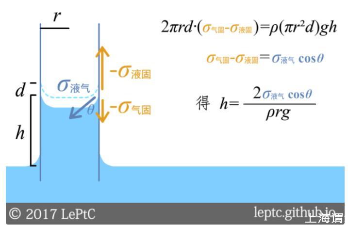 講到這里,我們已經(jīng)有三種方法來解釋這個現(xiàn)象了:①水想增加自己跟玻璃管內(nèi)壁的接觸面積,直到表面能的消耗不足以補(bǔ)償重力勢能;②固液接觸面的負(fù)張力把液體向上拉;③凹液面會降低液體內(nèi)的壓強(qiáng),從而外部氣壓把液體壓上來。三種方法都能推導(dǎo)出相同的結(jié)論,下圖中給出了第一種推法。