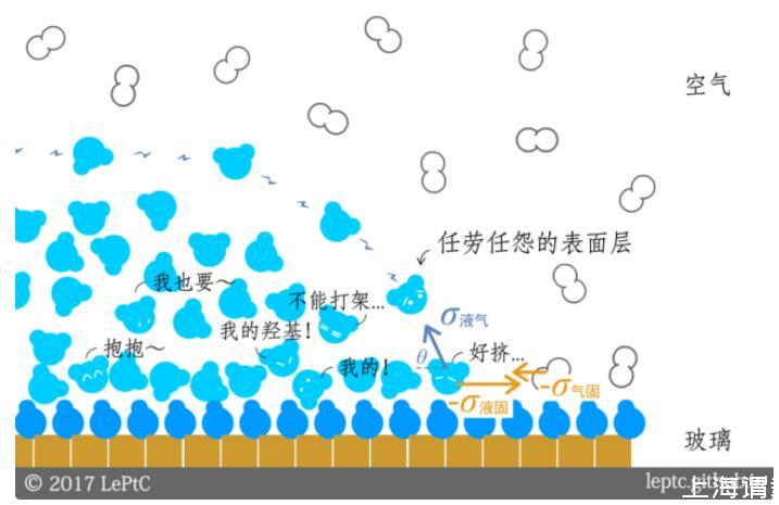 在氣體和液體之外,現(xiàn)在我們再加入新的角色——固體表面。玻璃的表面對水分子非常有吸引力(雖然玻璃的主要成分是二氧化硅,但它的表面通常會因?yàn)閮r(jià)態(tài)不飽和而結(jié)合很多羥基)。如果水滴碰到的界面是玻璃,就會出現(xiàn)跟空氣相反的情況:接觸面的水分子比平衡時更擠,表面張力是擴(kuò)張的,表面能是負(fù)的,整坨水滴會希望自己跟玻璃的接觸面積越大越好(同時跟空氣接觸面積越小越好),形成特定的接觸角θ。這個角越小,意味著固體表面的親水性越強(qiáng)。