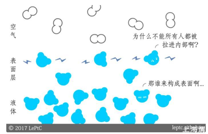要解釋表面張力,我們首先要走進(jìn)微觀世界,看看那些液體分子之間是如何互動的: