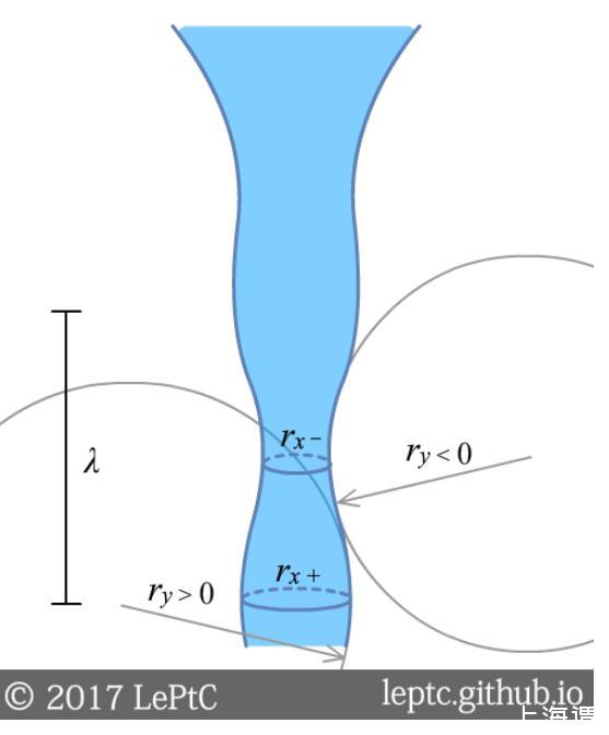 這一現(xiàn)象稱為普拉托-瑞利不穩(wěn)定性(Plateau–Rayleigh instability)。我們在柱狀界面上加一個波長為λ的擾動,橫截面上的曲率變化rx是促進(jìn)柱的分裂的,但縱截面上ry的曲率變化會阻礙分裂,后者的效應(yīng)隨λ變長而減弱。