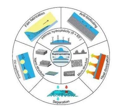 超鋪展領(lǐng)域的研究處于起步階段,盡管近年來取得了快速發(fā)展,但仍存在大量問題:機理方面,表面水分子的結(jié)構(gòu)與傳統(tǒng)熱力學(xué)中使用的固-氣、固-液表面張力的聯(lián)系仍十分模糊;如何從動力學(xué)角度理解納米結(jié)構(gòu)對超鋪展閾值的影響成為難題。應(yīng)用方面,超鋪展表面的長期穩(wěn)定性仍成為瓶頸,尤其對于暴露在空氣中的表面;大面積超鋪展表面的制備成本較高,限制了其大規(guī)模應(yīng)用。