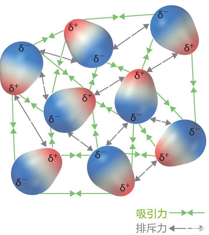 液體分子之間通常存在兩種相互作用力:范德華力和氫鍵,這兩種力使分子之間相互吸引又保持一定的距離,它們是由分子的化學(xué)電性質(zhì)決定的。