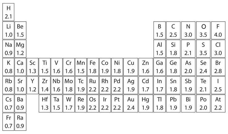 上圖是元素周期表中部分元素電負性的標量,電負性是一個無單位數(shù),數(shù)字越高,原子吸引電子的能力越強。我們可以通過確定參與共價鍵的兩個原子的電負性的差異來判斷共價鍵的極性:
