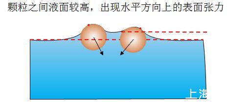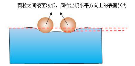 這時,讓兩個親水的物體緩慢靠近,當一個處于另外一個的毛細作用力范圍時,由于毛細作用的相互耦合作用,兩個球形顆粒之間的液面會比兩側(cè)要高,這就打破了原來每個球形顆粒所受液體表面張力的對稱性,使表面張力的合力不再是垂直向下。出現(xiàn)了水平方向的分力,表現(xiàn)為相互吸引,如圖3。