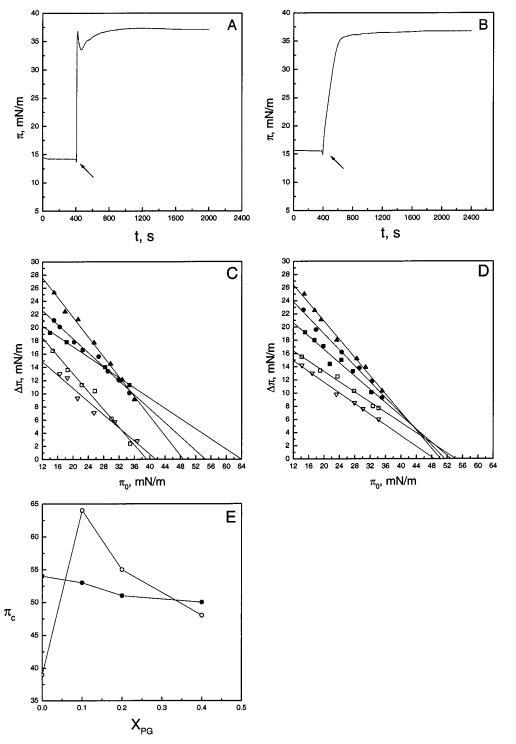 圖1:將時間蛋白B和L插入脂質(zhì)單層。在初始表面壓力(π0)分別為14.6和15.5 mN/m的情況下,在SOPC/POPG(XPOPG)0.2)單層下方注射顳蛋白B(面板a)或顳蛋白L(面板B)后,表面壓力隨時間的增加而增加。肽(0.3μM最終濃度)的添加用箭頭標(biāo)記。表面壓力增量(?π)將0.3μM顳蛋白B(圖C)或顳蛋白L(圖D)添加到亞相中導(dǎo)致的脂質(zhì)單分子膜的數(shù)量表示為初始表面壓力(π0)的函數(shù)。SOPC中POPG(XPOPG)的含量分別為0(0)、0.10(9)、0.20(b)和0.40(2)。還顯示了將肽插入具有Xchol)0.1(3)的SOPC膜中。圖E顯示了πc的值,分別作為滲透時間蛋白B(O)和時間蛋白L(B)時XPOPG的函數(shù)。每個數(shù)據(jù)點(diǎn)代表三次測量的平均值。標(biāo)準(zhǔn)偏差在0.1和0.8 mN/m之間變化,為清晰起見,未顯示。