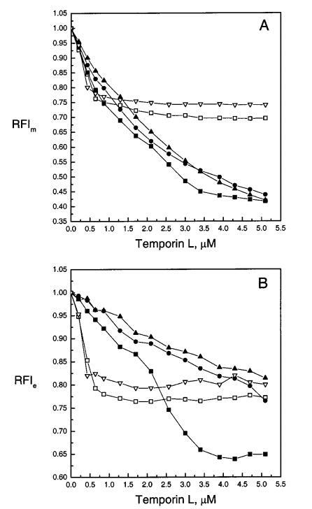 圖4:通過芘標(biāo)記的磷脂PPDPC(X)0.01的熒光評估顳葉素L對LUV中脂質(zhì)動力學(xué)的影響,分別顯示為芘單體和準(zhǔn)分子發(fā)射強(qiáng)度Im(圖A)和Ie(圖B)的變化。脂質(zhì)體由SOPC組成,XPOPG為0(0)、0.10(9)、0.20(b)和0.40(2),Xchol為0.10(3)。每個數(shù)據(jù)點(diǎn)代表三次測量的平均值。標(biāo)準(zhǔn)偏差小于0.02,為清晰起見,未顯示。否則情況如圖2圖例所示。