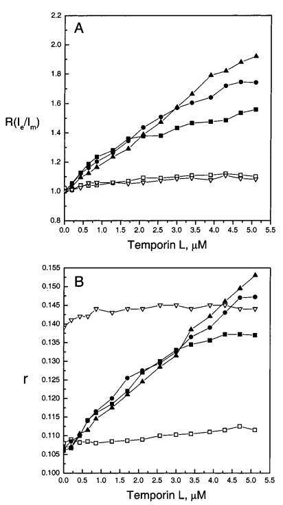 圖5:通過(guò)芘標(biāo)記的磷脂PPDPC(X)0.01)的熒光和DPH(X)0.002的穩(wěn)態(tài)發(fā)射各向異性r評(píng)估顳葉素L對(duì)LUV中脂質(zhì)動(dòng)力學(xué)的影響,顯示為含XPOPG)0(0)、0.10(9)、0.20(B)和0.40(2)的SOPC脂質(zhì)體中歸一化準(zhǔn)分子與單體比率r(Ie/Im)(圖A)和各向異性r(圖B)的變化,Xchol)0.10(3)。每個(gè)數(shù)據(jù)點(diǎn)代表三次測(cè)量的平均值。標(biāo)準(zhǔn)偏差小于0.02(面板A)和0.004(面板B),為清楚起見(jiàn),未顯示。否則情況如圖2圖例所示。