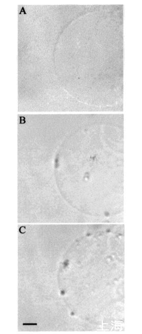時(shí)間蛋白對(duì)膜拓?fù)浣Y(jié)構(gòu)的影響。巨大脂質(zhì)體是生物膜的優(yōu)秀模型,因?yàn)槠涑叽缗c細(xì)胞相當(dāng)。此外,它們可以通過(guò)光學(xué)顯微鏡進(jìn)行觀察(15,21)。我們之前對(duì)馬加寧2和吲哚肽的研究表明,這些肽對(duì)巨大脂質(zhì)體膜的拓?fù)浣Y(jié)構(gòu)有顯著影響(15)。在本研究中,在類(lèi)似條件下,通過(guò)顯微鏡觀察了在巨大囊泡外表面添加這些肽后,temporins對(duì)巨大脂質(zhì)體三維拓?fù)浣Y(jié)構(gòu)的影響。SOPC巨脂質(zhì)體即使暴露于大量該肽(約1.2 fmol的temporin B)(每個(gè)重復(fù)100份12 amol)時(shí),也不受temporin B的影響。同樣,含有膽固醇(Xchol)0.10)的巨大囊泡也不受該量的顳葉素B的影響。然而,在將該肽添加到SOPC和SOPC/膽固醇(Xchol)0.10)巨大脂質(zhì)體的表面時(shí),偶爾會(huì)觀察到相鄰囊泡之間的粘附(數(shù)據(jù)未顯示)。然而,在POPG(XPOPG)0.10的存在下,已經(jīng)≈36 amol(10-18 M)的顳葉素B(約60 fL,3次注射)施加在巨大囊泡表面上,引起巨大囊泡膜拓?fù)浣Y(jié)構(gòu)的顯著變化(圖6,面板B)。具體來(lái)說(shuō),小顆粒(φ≈10μm),然后進(jìn)入巨大脂質(zhì)體的內(nèi)腔(圖6,面板B)。進(jìn)一步增加≈0.24 fmol的顳蛋白B(約400 fL,20次注射)導(dǎo)致巨大囊泡內(nèi)這些顆粒的數(shù)量增加(圖6,面板C)。還觀察到巨大囊泡表面的顆粒聚集(圖6,面板C)。隨后,在≈10分鐘后,將顆粒轉(zhuǎn)移到巨大脂質(zhì)體的內(nèi)腔中。