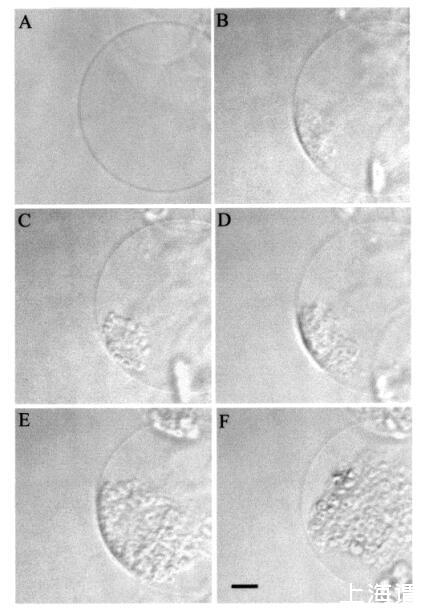 然后我們研究了顳葉素L對(duì)巨大脂質(zhì)體的影響。圖7所示的圖像序列說(shuō)明了由于temporin L引起的SOPC巨大脂質(zhì)體的轉(zhuǎn)化。有趣的是,大約12 amol temporin L(1次注射)已經(jīng)影響了SOPC膜的外觀,在添加肽后1秒內(nèi),巨大囊泡內(nèi)出現(xiàn)聚集結(jié)構(gòu)(圖7,面板B)。此外,相鄰的巨大囊泡也受到類(lèi)似囊泡形成的影響(圖7,面板B,研究的巨大脂質(zhì)體下方)。進(jìn)一步添加temporin L(最多≈0.12 fmol,共10次重復(fù)注射)不會(huì)誘導(dǎo)進(jìn)一步的囊泡形成,而兩個(gè)“內(nèi)吞”聚集體粘附在肽微注射部位的巨大脂質(zhì)體表面。大約5分鐘后,這兩個(gè)“內(nèi)吞”聚集體粘附在一起,在巨大囊泡內(nèi)形成一個(gè)更大的聚集體結(jié)構(gòu)(圖7,面板C)。與顳葉素L對(duì)SOPC巨脂質(zhì)體的作用類(lèi)似,該肽在POPG(XPOPG)0.10存在下誘導(dǎo)類(lèi)內(nèi)吞過(guò)程,圖8)。更具體地說(shuō),在添加約12 amol的temporin L(1次注射)后,暴露于肽的巨大脂質(zhì)體表面的區(qū)域變暗,顯示折射率的顯著變化,并指示形成緊密堆積的三維結(jié)構(gòu),僅部分保留在焦平面中(圖8,面板B)。在內(nèi)部≈1秒后,巨大脂質(zhì)體內(nèi)出現(xiàn)了小顆粒聚集體和暗區(qū)(圖8,面板C)。同時(shí),還觀察到相鄰巨大囊泡中的囊泡形成(圖8,圖B和圖C)。隨后總共增加了≈24阿米爾的顳葉素L(2次注射)使另一組“內(nèi)吞”小顆粒出現(xiàn)在巨大脂質(zhì)體內(nèi),與先前形成的聚集體粘附(圖8,面板D)。之后≈1分鐘,其中一些顆粒(φ≈8μm)從巨大脂質(zhì)體內(nèi)的雙層釋放(數(shù)據(jù)未顯示)。有趣的是,在進(jìn)一步添加約12 amol的Temporain L(總共3次注射)后,分離的小顆粒再次聚集,暗區(qū)的面積增加(圖8,面板E)。暗區(qū)面積的增加通過(guò)添加另一個(gè)≈24 amol temporin L(共5次注射)。幾分鐘后,聚集的“內(nèi)吞”小顆粒進(jìn)入巨大囊泡的內(nèi)腔,而膜表面的暗區(qū)消失(圖8,面板F)。同時(shí)觀察到相鄰的巨大脂質(zhì)體的囊泡形成。有趣的是,在膽固醇(Xchol)為0.10的情況下,需要更多的時(shí)間蛋白L來(lái)誘導(dǎo)囊泡形成(圖9)。然而,在添加約0.24 fmol(20次注射)的Tempolin L后,小顆粒的“內(nèi)吞”聚集物以及≈巨大脂質(zhì)體內(nèi)出現(xiàn)直徑為9μm的顆粒(圖9,面板B)。隨后添加≈0.24 fmol的肽(共40次注射)在巨大囊泡內(nèi)誘導(dǎo)另一組小顆粒,約30秒后與第一個(gè)聚集物合并(數(shù)據(jù)未顯示)。然而,隨后進(jìn)一步添加temporin L(高達(dá)約1.2 fmol,100次注射)對(duì)巨大脂質(zhì)體膜沒(méi)有進(jìn)一步的可見(jiàn)變化。