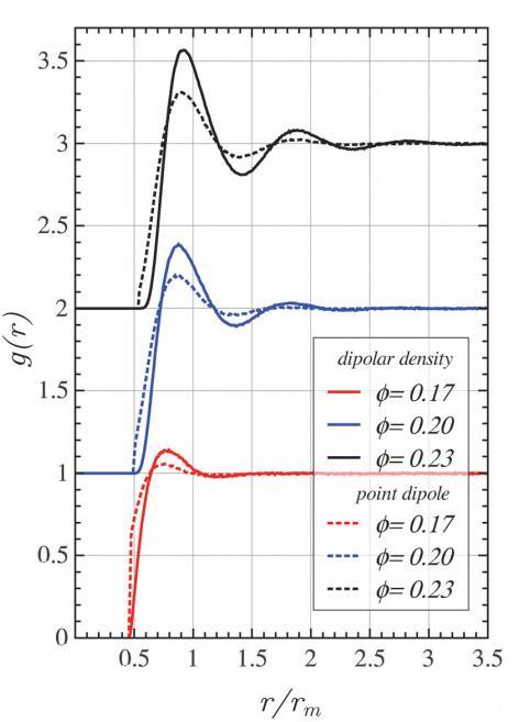 在第一個峰值位置和g(r)開始偏離零的小區(qū)域觀察到輕微差異。當系統(tǒng)更加結構化時,協(xié)議會得到改善。特別是,對于弱相互作用域,差異開始明顯。這些偏差是由于點偶極力在接觸時趨于有限值,而在偶極密度情況下,它會發(fā)散。因此,硬盤相互作用與點偶極子模型有關。