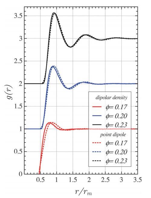 域相互作用的一個簡單近似是將每個域視為具有排除體積的點偶極子。6,37該方案的優(yōu)點是具有相互作用力的簡單解析表達式,即eqn(7),因此比全偶極密度相互作用更容易實現。為了評估該近似在所考慮的面積分數范圍內的有效性,我們系統(tǒng)地研究了點偶極系統(tǒng)的結構特性,并將其與相應的偶極密度系統(tǒng)進行了比較。圖8顯示了使用相同參數集[f,f0,r]的兩種方案的g(r)??梢郧宄赜^察到,點偶極子近似不能正確地表示結構;在所有情況下,它都低估了配對相關性。我們發(fā)現,如果將點偶極子模型的f0視為有效相互作用強度f p0,并調整以匹配偶極密度g(r)的第一峰值高度,則可以實現良好的一致性。圖9顯示了前一節(jié)中分析的三個系統(tǒng)。