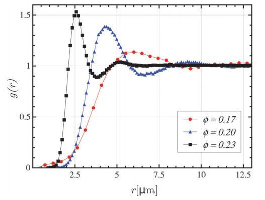 圖5顯示了三個實驗系統(tǒng)的徑向分布函數。在所有情況下,g(r)類似于液體,顯示出明確的第一峰(在rmax處),其表征了第一配位殼層,即最近鄰。此外,對于f=0.20和f=0.23的系統(tǒng),觀察到與第二配位殼對應的標記的第一最小值和第二最大值。由于“強”排斥作用,最近鄰距離遠大于平均磁疇直徑。因此,硬核斥力不是結構的決定因素,系統(tǒng)的特征長度是平均幾何距離rm=r 1/2。