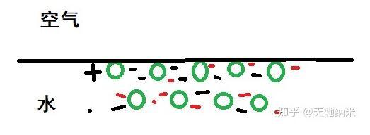 但是問題來(lái)了。水面的這一排分子,上面沒有水分子了。于是對(duì)著空氣的這一面,電荷沒有辦法被抵消了。于是電荷就開始亂七八糟了。但是整體上還是平衡的。